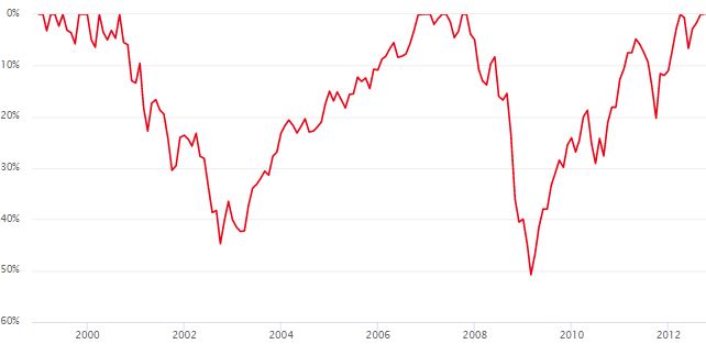 Our tools help clients avoid the pain that many experienced in the 2000 and 2002 stock market crashes. See the following chart from the OnPointe Risk Analyzer software from January 1999 to December 2012. It shows the negative drawdown people experienced if they were invested in the S&P 500 stock index.